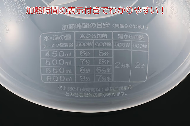 しかも水位目盛り付きだからラクに水位を量ることが出来て、加熱時間も表記されているので、袋麺メーカーが推奨する水の量で作る事ができます。