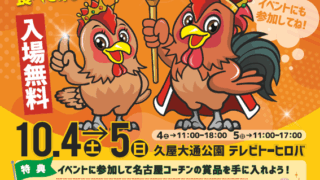 イベント 名古屋コーチンぐるめフェス 愛知県が誇る日本三大地鶏の一つ「名古屋コーチン」の魅力を存分に味わえる食の祭典「名古屋コーチンぐるめフェス IN 栄 2025(地鶏フェア)」が、2025年10月4日(土)・5日(日)の2日間、名古屋市中区の久屋大通公園・テレビトーヒロバ... 2025.10.01 イベント情報