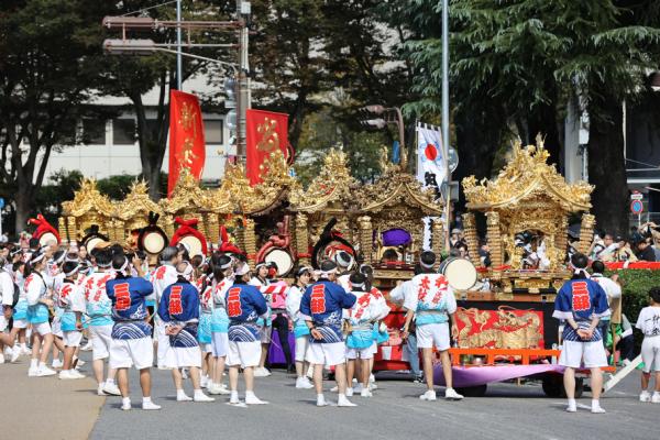 まつりのメインイベントは、織田信長・豊臣秀吉・徳川家康の三英傑が鎧武者を従えて練り歩く「郷土英傑行列」で、ほかにも市指定文化財の山車揃や神楽揃、華やかなフラワーカーパレード、姉妹友好都市による親善パレードなど、多彩な行列が街を彩ります。