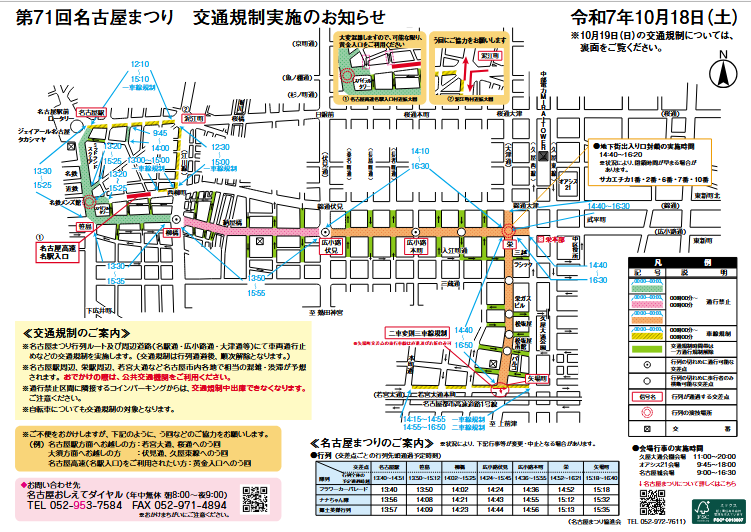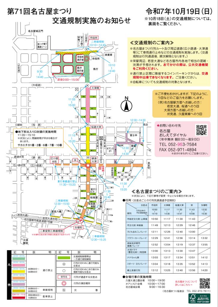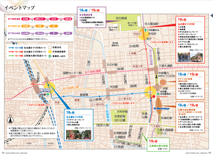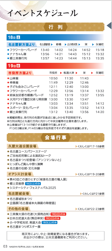 また、郷土芸能祭やシスターシティ・フェスティバルなどの会場行事も久屋大通公園などで行われ、名古屋城や東山動植物園など市内の観光施設が無料開放されるなど、名古屋の歴史・文化・国際交流が一堂に会する盛大な祭典です。