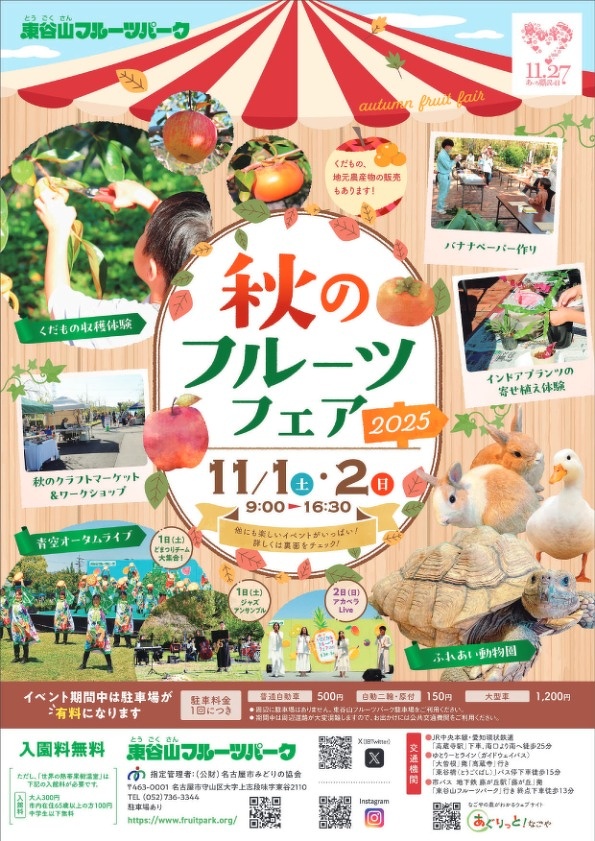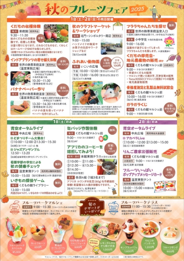 秋のくだもの即売会や果物の収穫体験、各種ステージイベント、クラフトマーケット、ふれあい動物園など、大人から子どもまで楽しめる催しが盛りだくさんです。