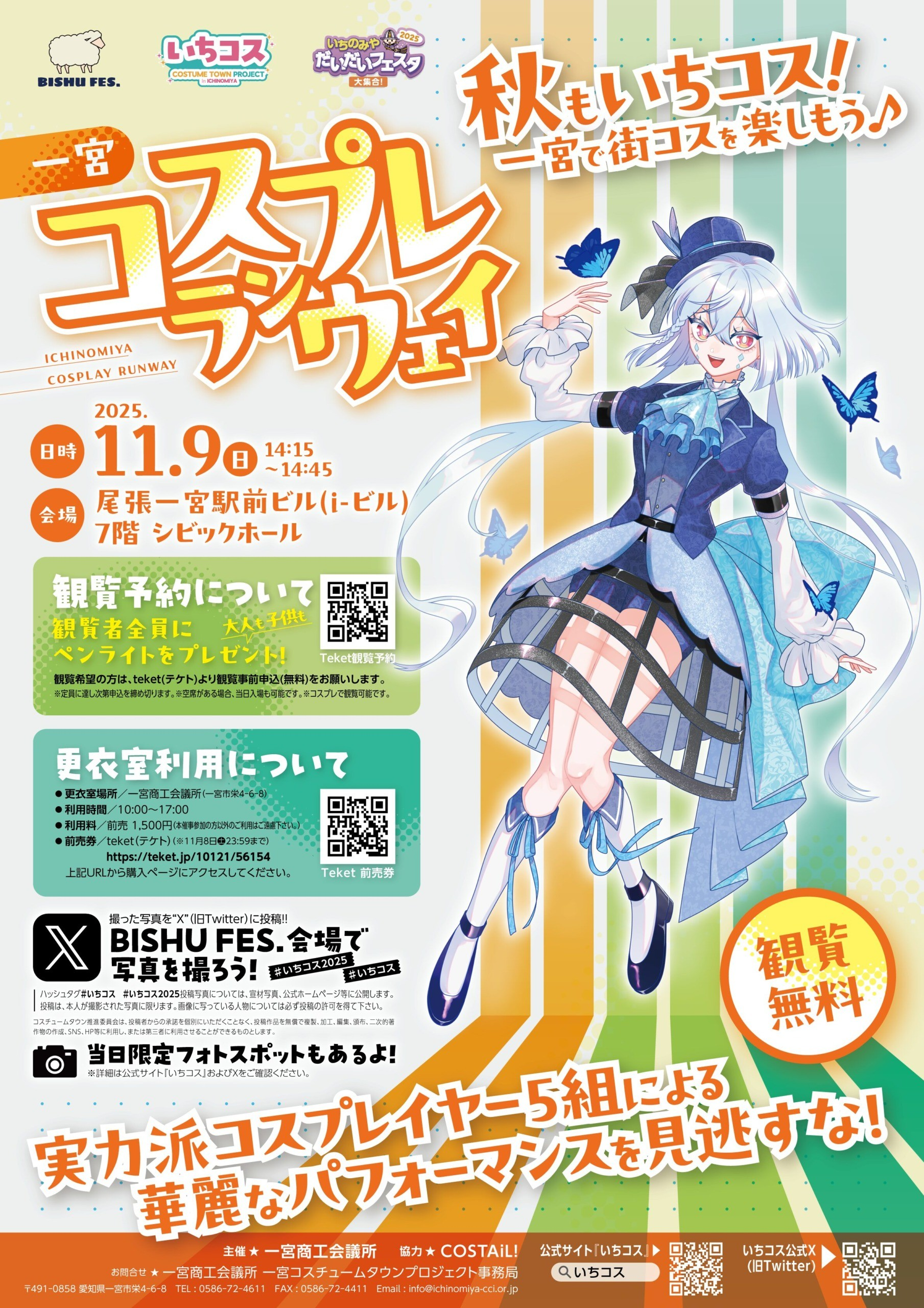 | コスプレランウェイ | 開催場所:尾張一宮駅前ビル(i-ビル)7階 シビックホール 開催時間:14:15~14:45(予定) 参加費:観覧 無料 観覧受付時間:14:00~14:15 観覧受付場所:尾張一宮駅前ビル(i-ビル)7階 シビックホール入口 ・更衣室利用チケット購入の方は、別途観覧事前申込の必要はありません。 ・観覧受付にはteketにて事前の観覧申込が必要です。(無料) 下記URLからアクセスし、「観覧券」0円を選択し、お手続きをお願いします。 https://teket.jp/10121/56154 |