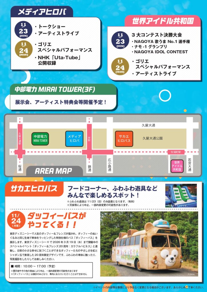 開催時期を夏から秋へ移し、各メディアの協力のもと、音楽ライブや各種コンテスト、NHK名古屋「Uta-Tube」の公開収録、ダッフィーバス展示など、老若男女が楽しめるエンターテインメントが盛りだくさんのイベントです。