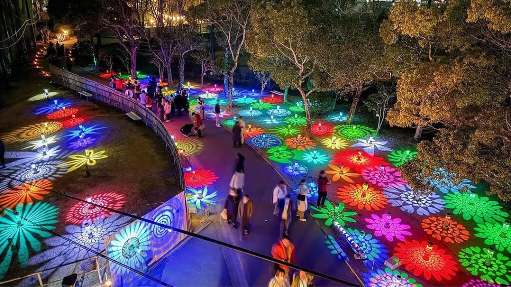 様々な模様の灯籠から地面に映し出される鮮やかな光を楽しむことができます。ぜひお気に入りの灯籠を探してみてください。