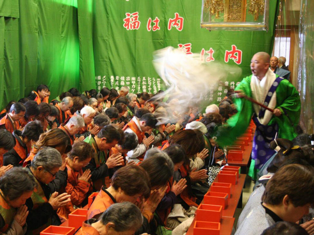 本堂内で開運厄除けの祈祷を受け、「福は内!」の掛け声とともに豆をまき、一年の無事息災を祈願します。