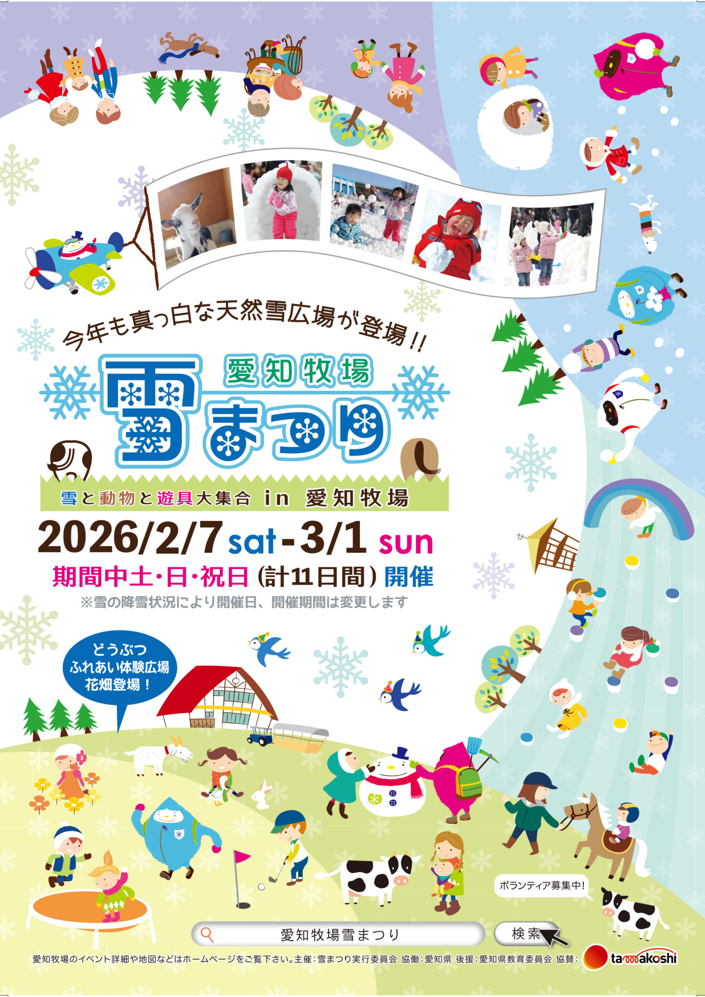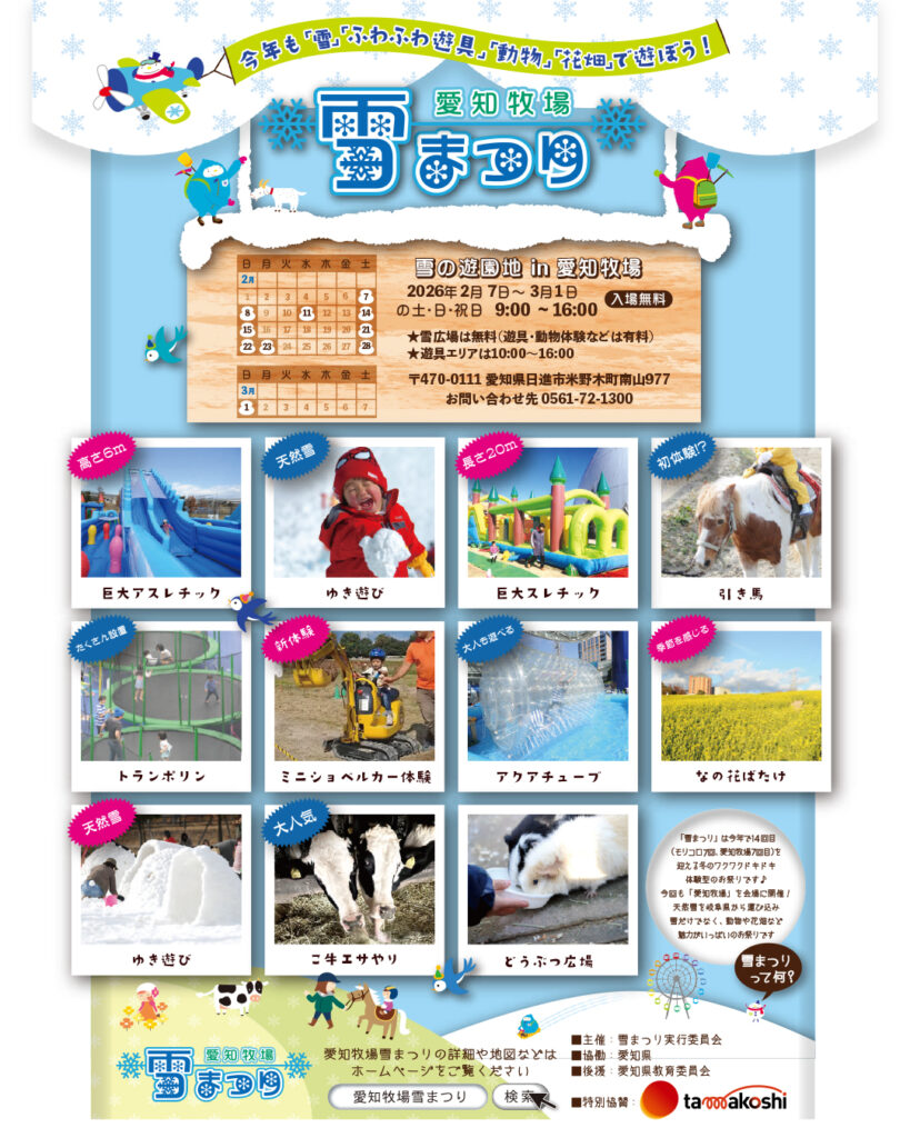2026年2月7日(土)~3月1日(日)の土日祝10日間、愛知牧場で毎年恒例の「雪まつり」を開催します。
