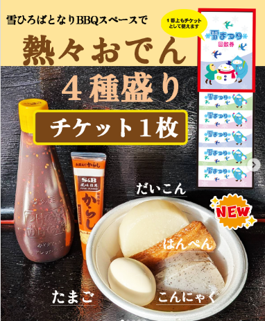 熱々おでん4種もり、愛知牧場特製ラーメン(チケット2枚)など。