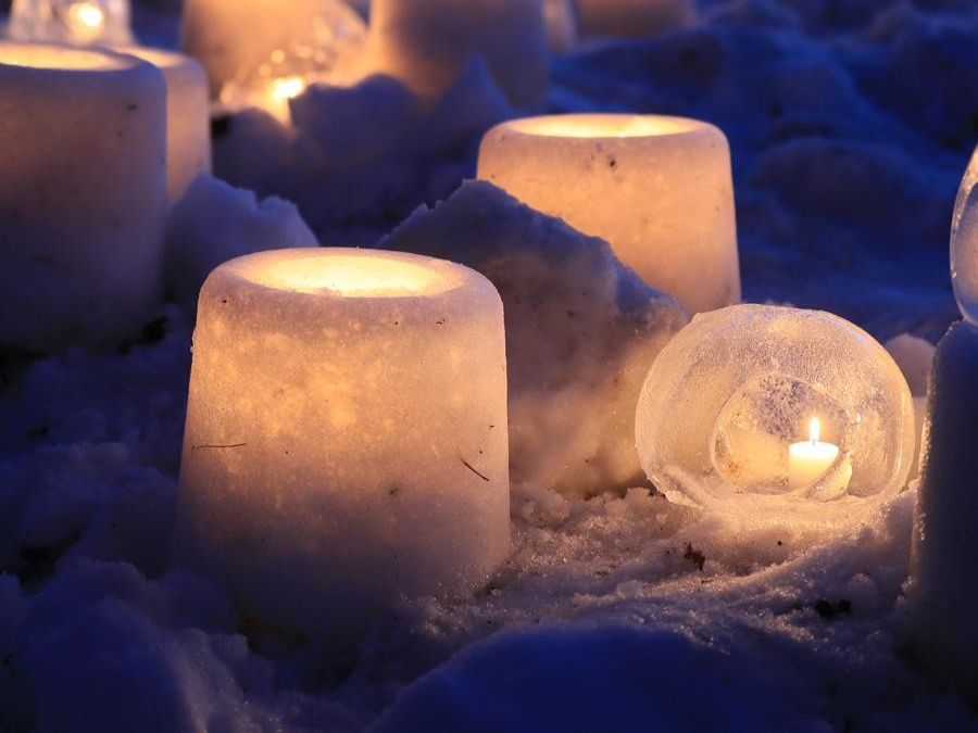 雪景色の中、雪で作られた灯ろうや間伐材を活用した木製ランプシェードにキャンドルのやさしい灯りがともり、あたり一面が神秘的な光に包まれます。