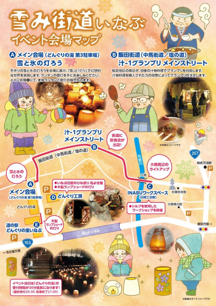 また、「いなぶ旧暦のひな祭り」と同日開催のため、昼はひな人形を巡り、夜は雪灯りを楽しむという、一日を通して稲武の魅力を満喫できます。