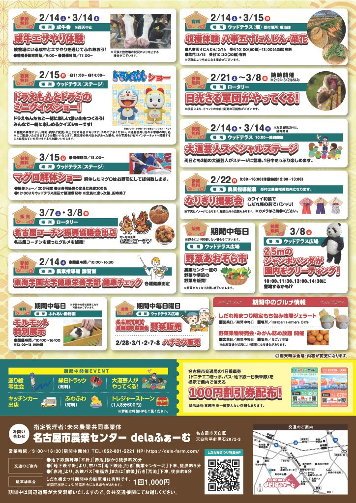 また、収穫体験や成牛のエサやり体験といった農業センターならではの体験型イベントのほか、ドラえもんとドラミのミニクイズショー、マグロ解体ショーなど、子どもから大人まで楽しめる企画も充実で、さらに3月には、期間限定で名古屋コーチンに関する催しも予定されています。