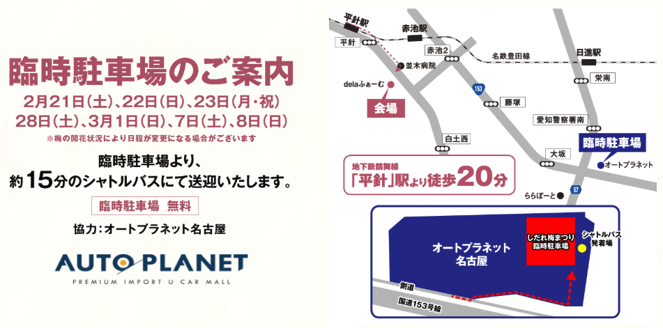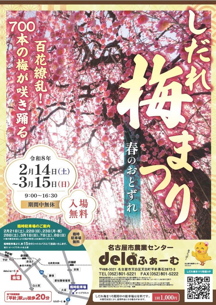 名古屋市天白区にある名古屋市農業センターdelaふぁーむでは、2月14日(土)から3月15日(日)まで、毎年恒例の「しだれ梅まつり」が開催されます。