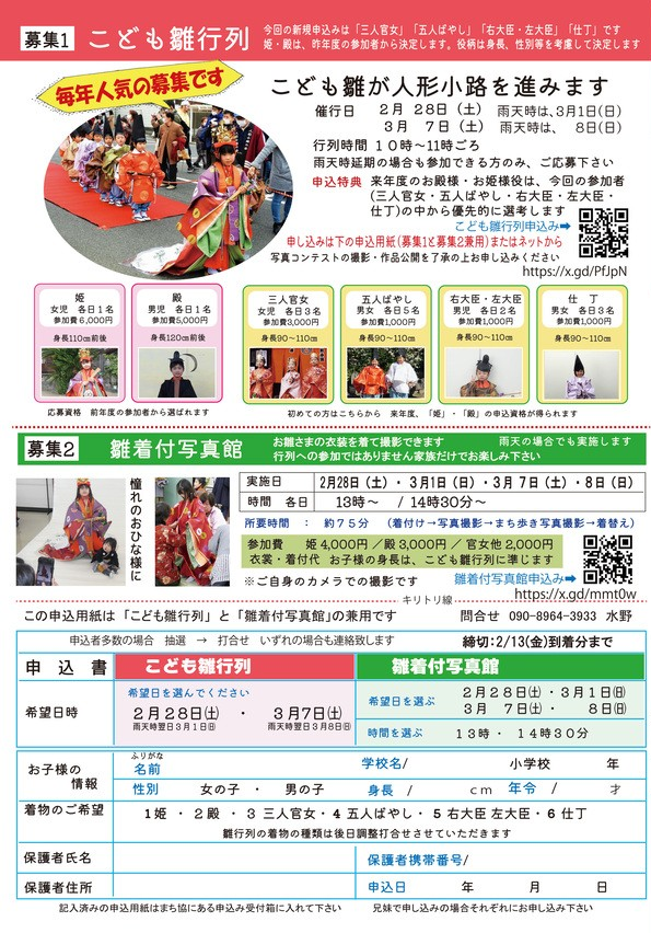 雛人形や人形小路の春を撮影してご応募ください。1日と8日は雛行列のシャッターチャンスです。