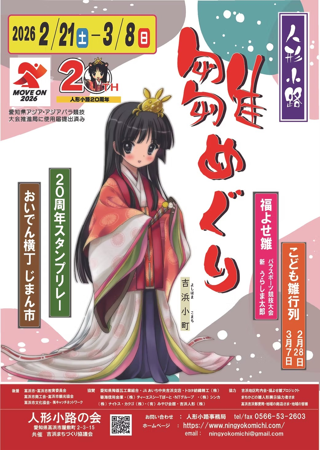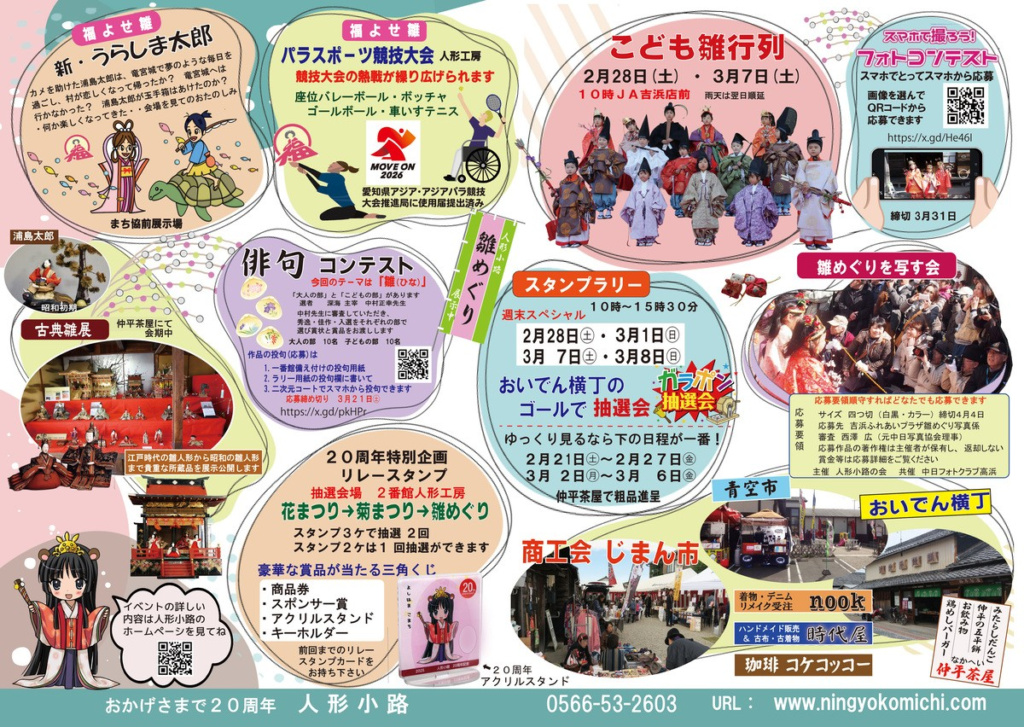 また、土雛の絵付け体験や瓦モチーフのスイーツ・雑貨など高浜らしい楽しみも充実し、人形小路20周年を記念したリレースタンプや、商工会のじまん市、おいでん横丁など買い物やグルメも満喫でき、見て食べて春を感じられる催しとなっています。