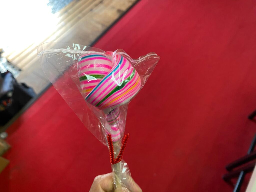 竹の先に白・赤・青・黄などの飴を丸く練り固めたもので、子どものへその緒を象った縁起物とされ、2月26日にしか授与されない。