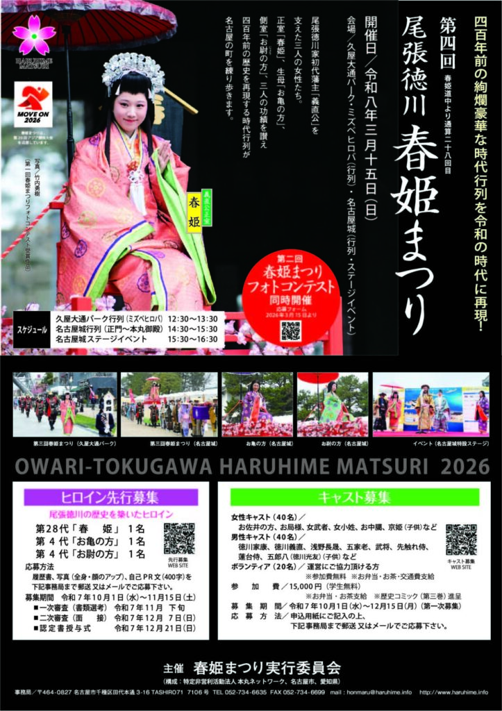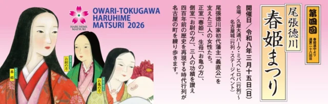 3月15日(日)に開催される「春姫まつり」は、尾張徳川家の歴史と文化を現代に伝える名古屋の歴史イベントで、舞台となるのは名古屋城周辺や久屋大通パークなど名古屋の中心部、四百年前の絢爛豪華な時代行列を令和の時代に再現し、尾張徳川の歴史を多くの人に伝えることを目的として行われます。