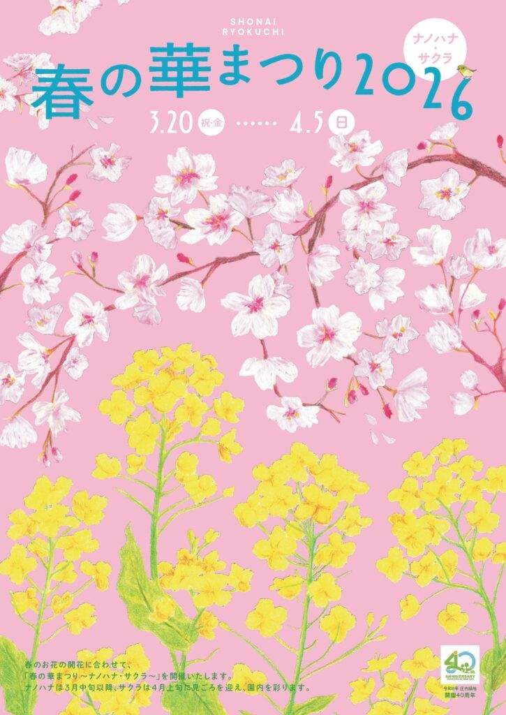 春になると園内には約700本のソメイヨシノと約20,000本のナノハナが咲き誇り、黄色い花畑と桜の景色が広がり、ナノハナは3月中旬以降、サクラは4月上旬頃に見頃を迎える見込みです。