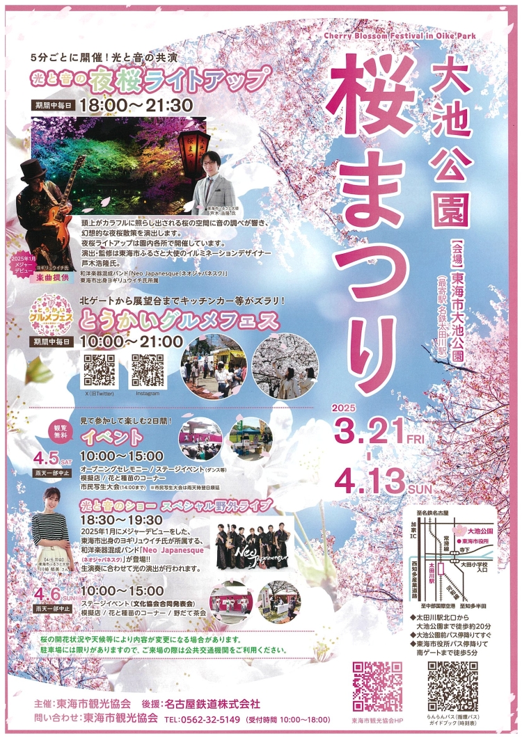 また、大池周辺では東海市ふるさと大使の芦木浩隆さんが演出・監修を担当し、東海市出身のヨギリュウイチさんが所属する音楽ユニット「Neo Japanesuqu」の楽曲とともに楽しめる「光と音の夜桜ライトアップ」も実施されます。