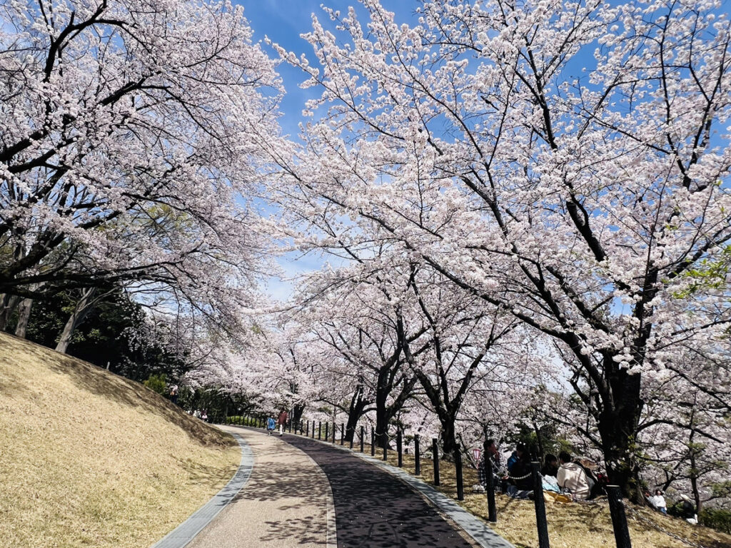 園路沿いや公園周辺では桜が連なり、まるでピンク色の花のトンネルのような美しい景色を楽しむことができます。