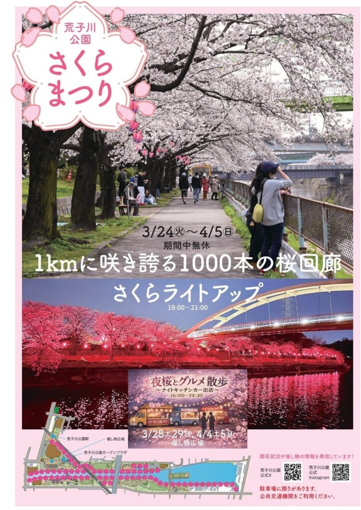 さらに、桜のライトアップが期間中毎日18時から21時まで実施され、昼間とは異なる幻想的な夜桜の風景を楽しめるのも大きな魅力で、今年は「夜桜とグルメ散歩」と題したナイトキッチンカー企画も行われ、3月28日・29日、4月4日・5日の土日に16時から19時30分まで出店が予定されており、夕暮れから夜にかけて特別な時間を過ごすことができます。