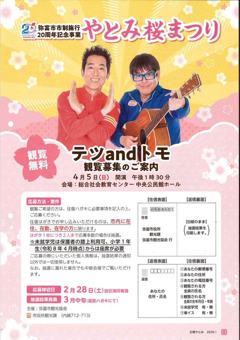 今年は市制施行20周年を記念し、市民ステージに人気お笑いコンビのテツandトモが登場し、来場者と一体となって楽しめる内容が予定されており、世代を問わず笑顔あふれるひとときをお届けします。