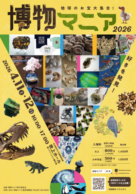自然科学をテーマにした展示即売イベント「地球のお宝大集合!博物マニア 2026」が、2026年4月11日(土)・12日(日)の2日間、名古屋市中小企業振興会館 吹上ホールで開催されます。
