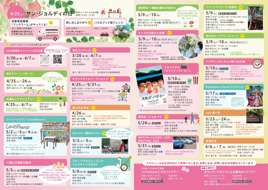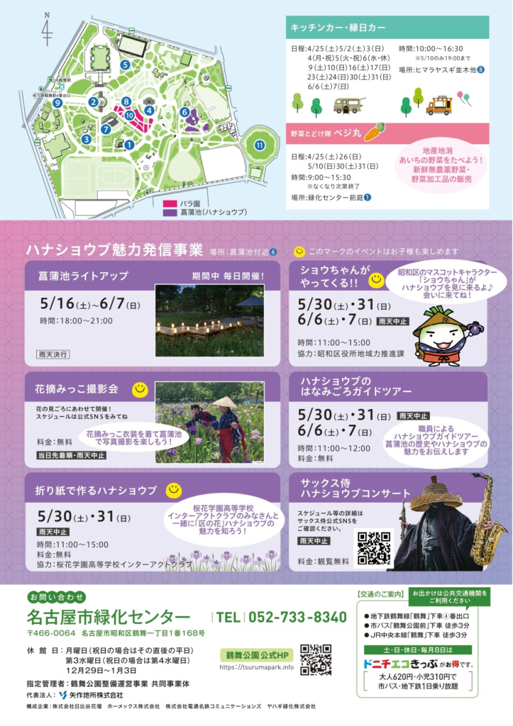 期間中の週末には音楽ステージやマルシェ、花見頃ガイドツアーなど多彩な催しが開催され、花の知識を深めながら楽しめるのも魅力のひとつで、バラ、ハナショウブ、アジサイと季節の花々が次々に見頃を迎え、訪れるたびに違った表情を楽しめる、名古屋を代表する花のイベントです。